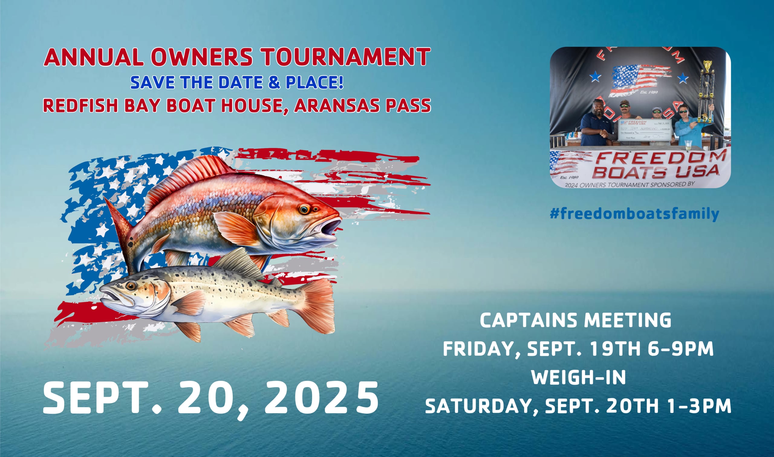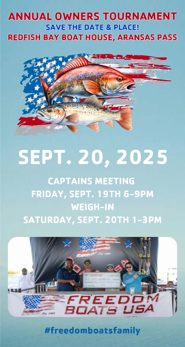 Freedom Boats USA is hosting its Annual Owners Tournament at the Redfish Bay Boat House in Aransas Pass on September 20, 2025. The Captains Meeting will take place Friday, September 19th from 6–9 PM, with the weigh-in scheduled for Saturday from 1–3 PM.